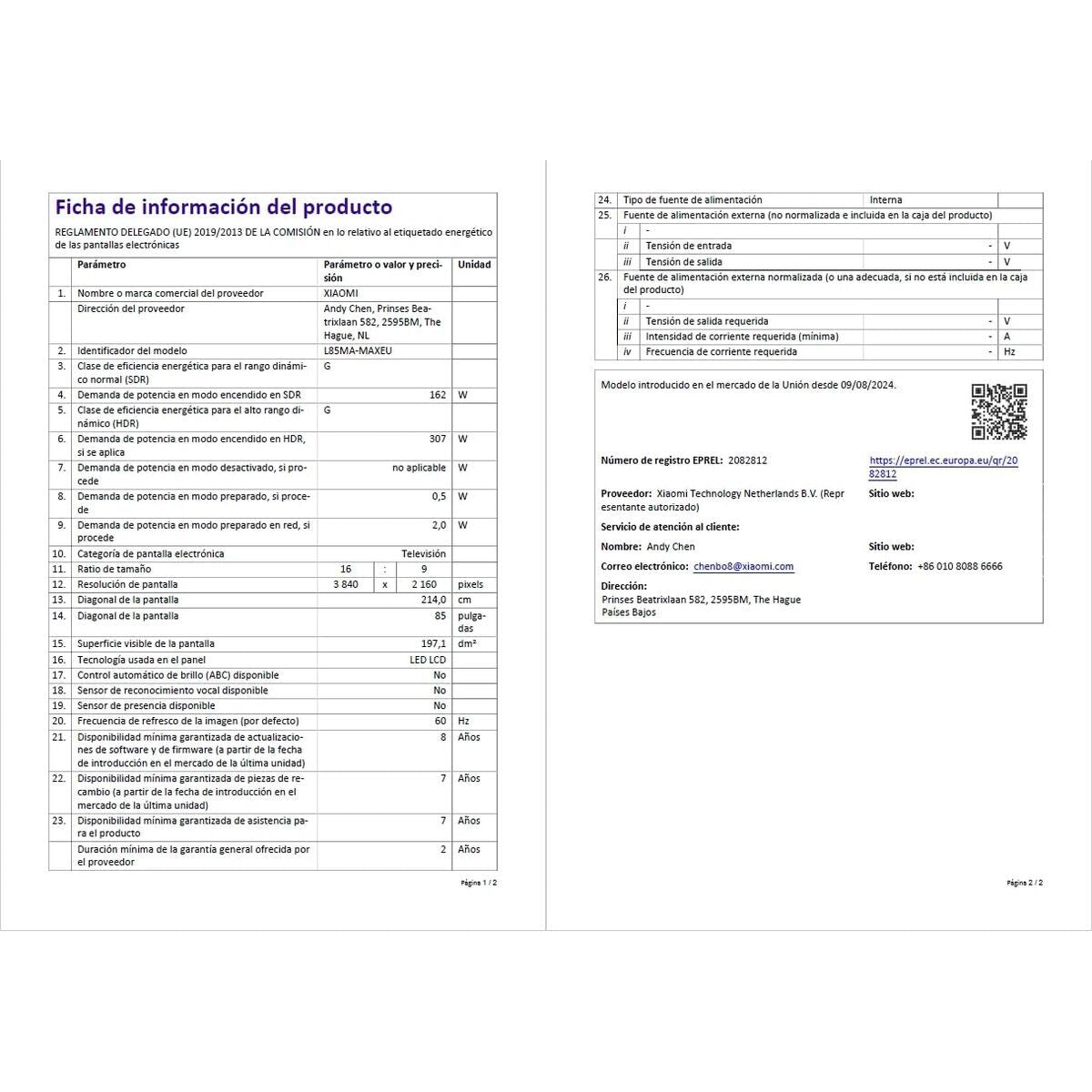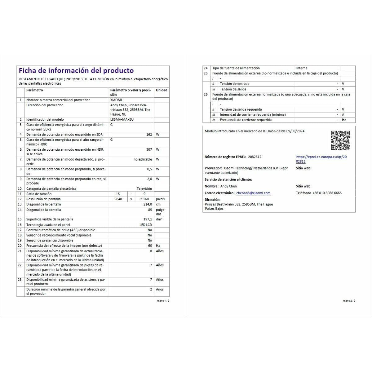 The Smart TV 85" Xiaomi model ELA5730EU delivers an impressive visual experience thanks to its 85-inch QLED screen with a 4K Ultra HD resolution of 3840 x 2160 pixels, ensuring sharp images, vivid colors, and great detail even on large formats. This TV features an elegant gray design with metal materials that provide durability and a modern style that fits easily into spacious living rooms. It also has a standard 16:9 aspect ratio for proper widescreen content viewing. Regarding connectivity, it includes Bluetooth to wirelessly link external devices and multiple USB 2.0 ports for direct playback of multimedia content. The installed operating system is the well-known Google TV, offering access to a wide range of apps and streaming services with an intuitive interface and frequent updates. For signal reception, this model integrates a multi-digital tuner compatible with DVB-C, DVB-S2, and DVB-T2, ensuring versatility to receive cable, satellite, and terrestrial channels without extra devices. Its AMD FreeSync technology reduces screen tearing and improves smoothness in fast-motion scenes, ideal for gaming and sports. It features built-in Wi-Fi and Miracast support, allowing easy wireless screen and content sharing from mobile devices. On audio, it offers an estimated power of 30W RMS, capable of delivering adequate sound for medium-sized rooms without external amplification. With an energy rating of G, it is designed for those seeking a large TV with advanced technology, smart features, and robust connectivity, all within a sober and modern aesthetic. In summary, the Xiaomi ELA5730EU is a versatile choice combining superior visual quality and multiple connection options, suitable for users demanding a large-format TV with full features for digital entertainment and leisure.