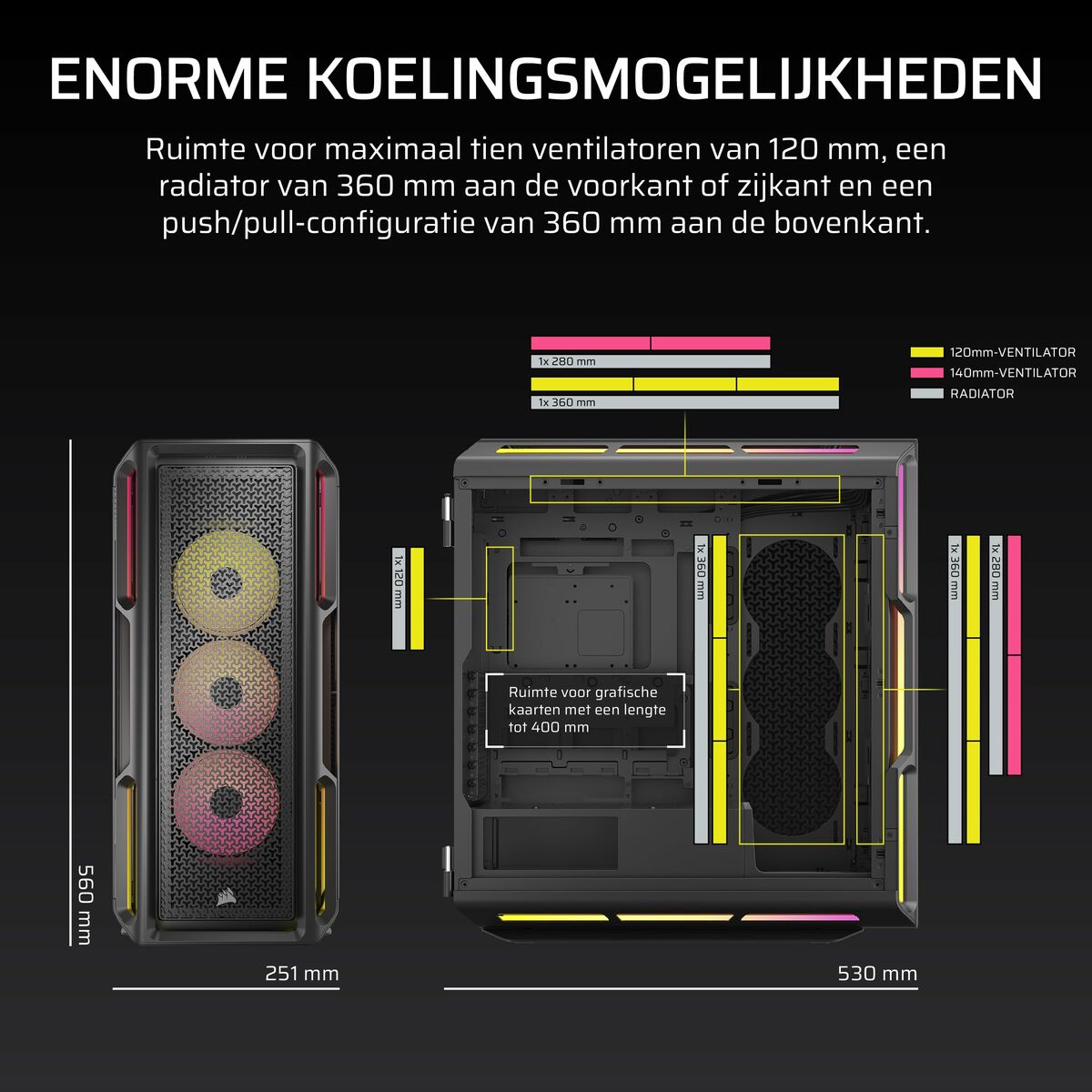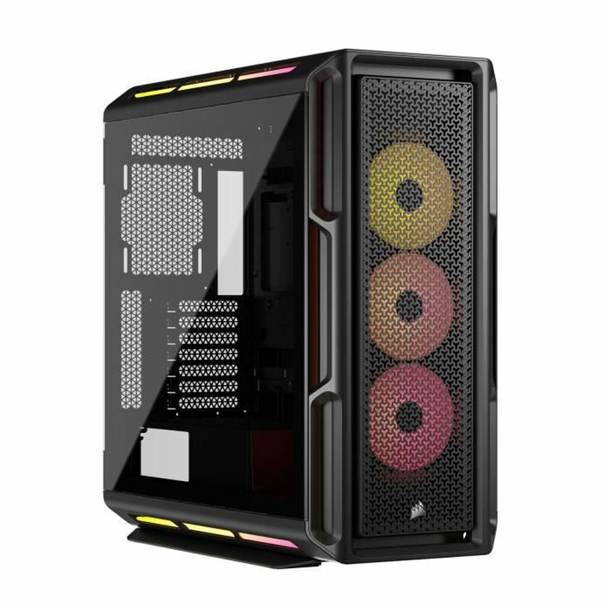The Corsair 5000T LX RGB ATX Mid-Tower Case is an advanced and versatile solution for building high-performance systems, combining a robust and stylish design with features aimed at demanding users. This case stands out with its elegant black finish, complemented by customizable multicolor RGB lighting that creates unique visual environments through integration with iCUE LINK, Corsair’s proprietary technology for syncing lights and controlling components. Made of high-quality steel and equipped with transparent tempered glass panels, it offers structural strength alongside excellent visibility of internal hardware, giving it special appeal for gaming setups and carefully designed PCs. Regarding compatibility, this case supports multiple form factors, including ATX, mATX, and Mini-ITX, providing great flexibility for motherboards of various sizes and configurations. Its mid-tower design allows optimal space management, improving airflow for adequate cooling of demanding components during extended use. This feature is especially relevant for gamers and enthusiasts who need to keep temperatures low to preserve system performance and durability. The case also includes options for efficient cable management, contributing to a clean aesthetic and easy maintenance. Overall, the 5000T LX RGB from Corsair combines functionality, build quality, and advanced design, positioning itself as a robust and stylish choice for those looking to build and customize their system with premium materials and synchronized lighting technology. It is a product aimed at users who value versatility, style, and reliable performance in their computing platform.